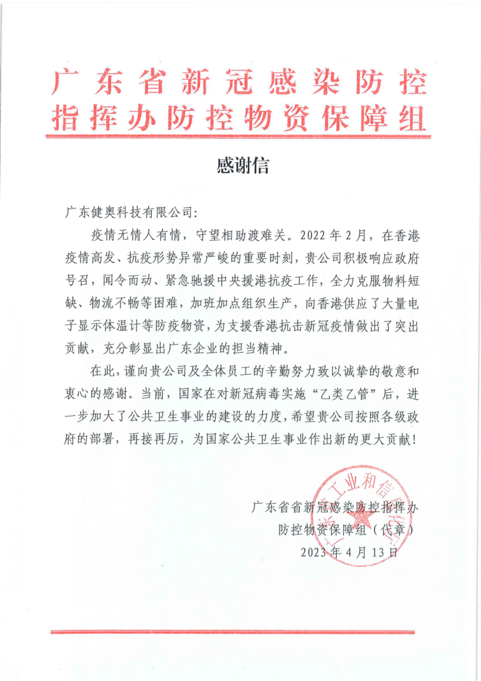 4月13日,健奧科技收到這么一封特別來信。信中對健奧科技在2022年為圓滿完成援港防疫物資供應、支持全省疫情防控工作作出的貢獻給予了充分的肯定。 這封信正是來自廣東省新冠感染防控指揮辦防控物資保障組的感謝信。