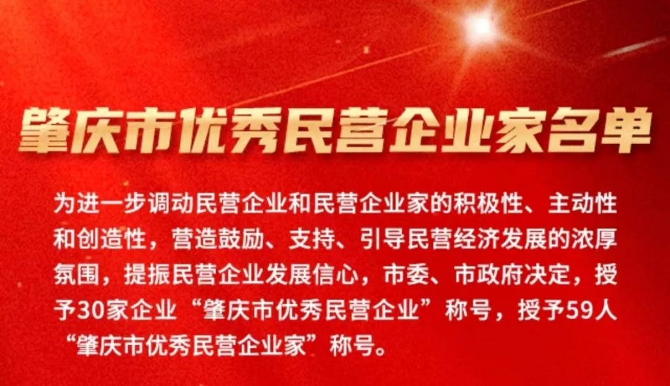 為進一步調動民營企業和民營企業家的積極性、主動性和創造性,營造鼓勵、支持、引導民營經濟發展的濃厚氛圍,提振民營企業發展信心,市委、市政府決定,授予30家企業“肇慶市優秀民營企業”稱號,授予廣東健奧科技有限公司董事長石榮等59人“肇慶市優秀民營企業家”稱號。